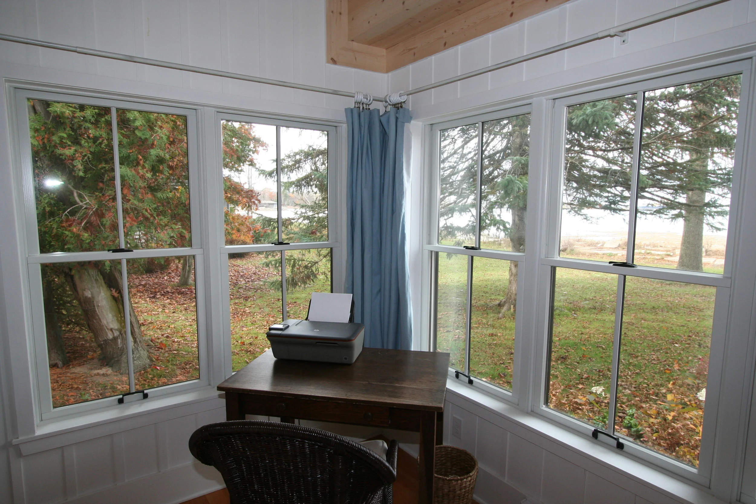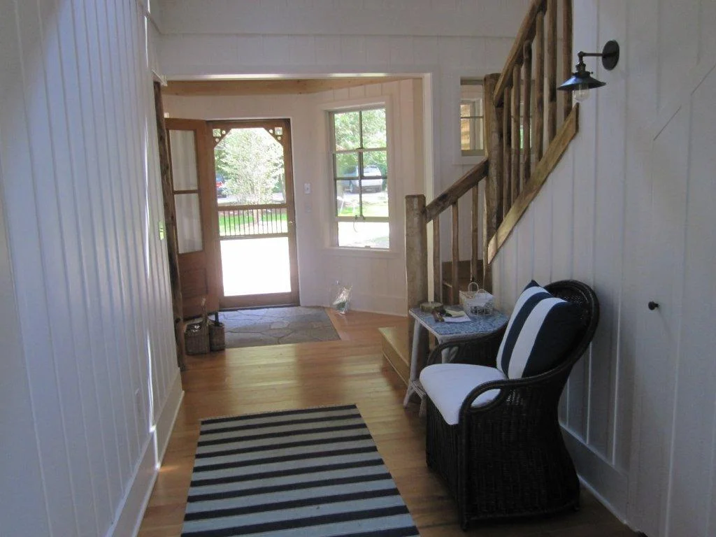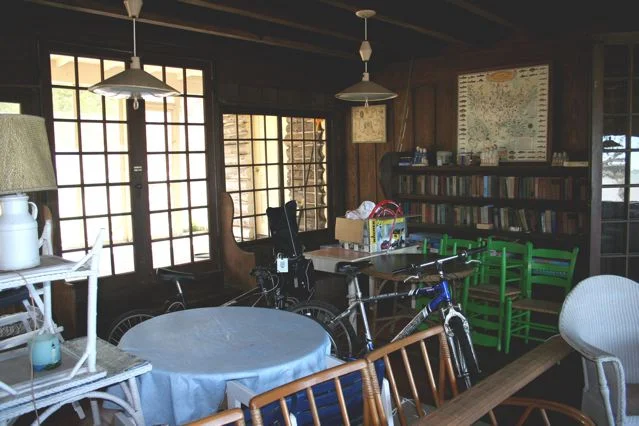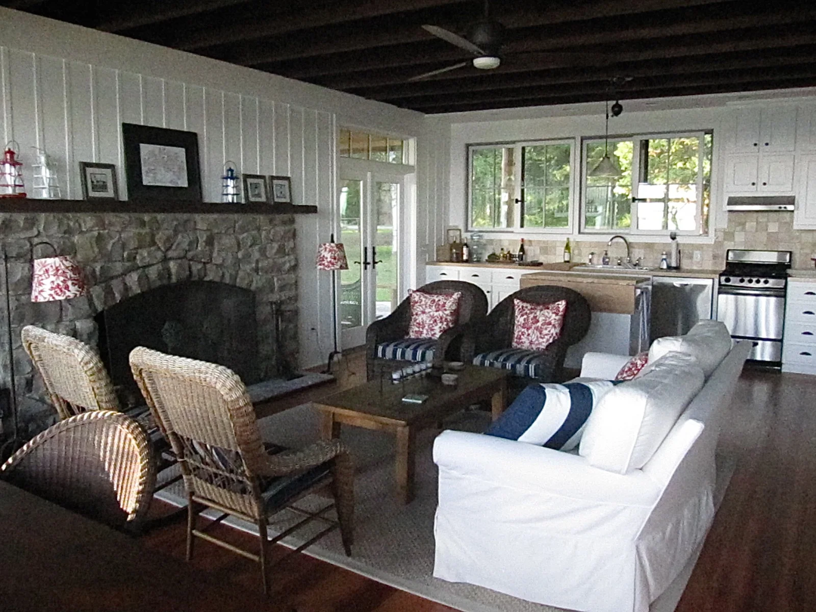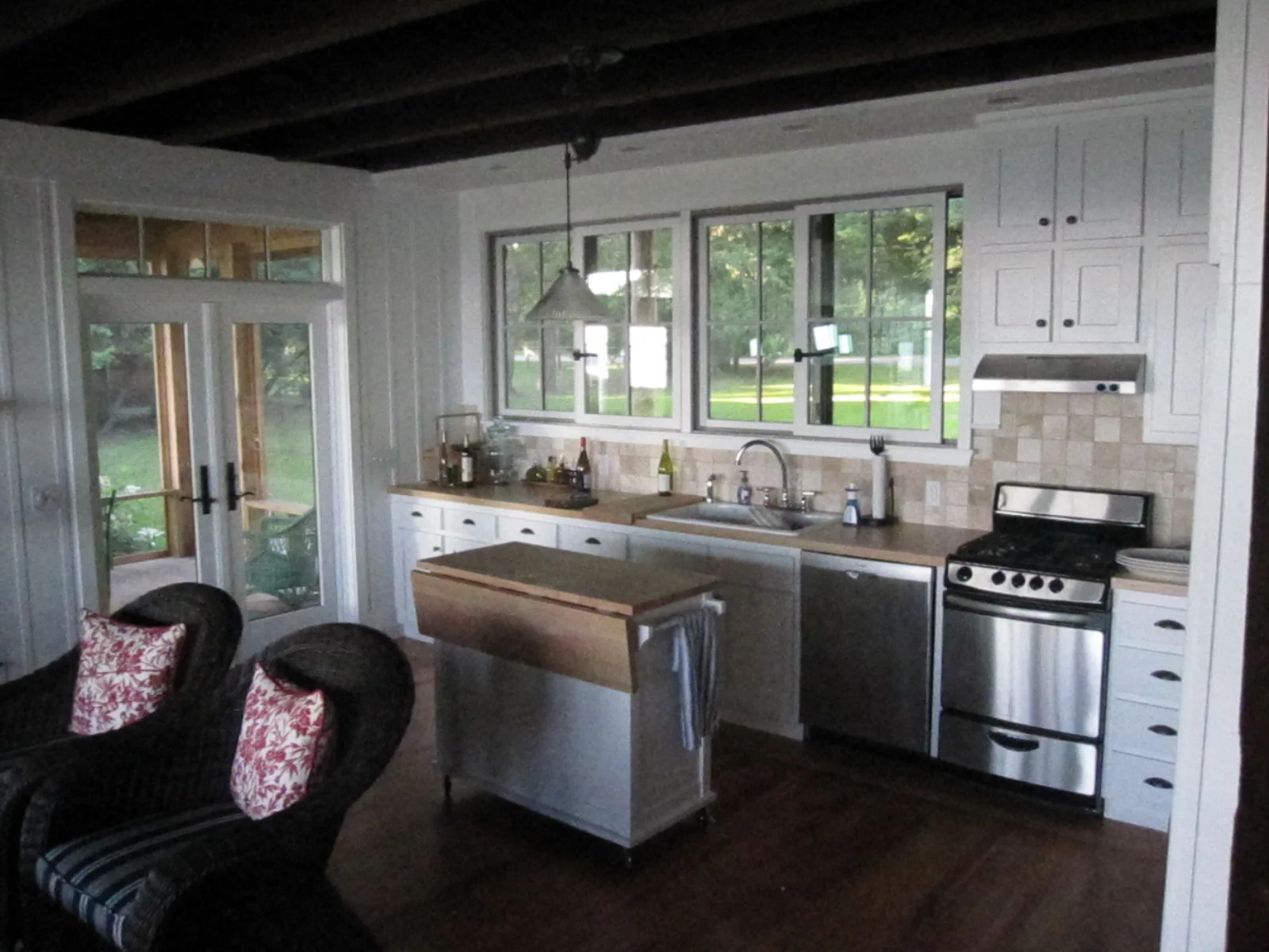 This beautiful and serene modern kitchen was transformed from the image below. The owner's wanted the exterior to stay intact as part of the remodel. The large island houses pot and pan storage, beverage coolers, produce cooler, prep sink and a pop up outlet for appliances.
